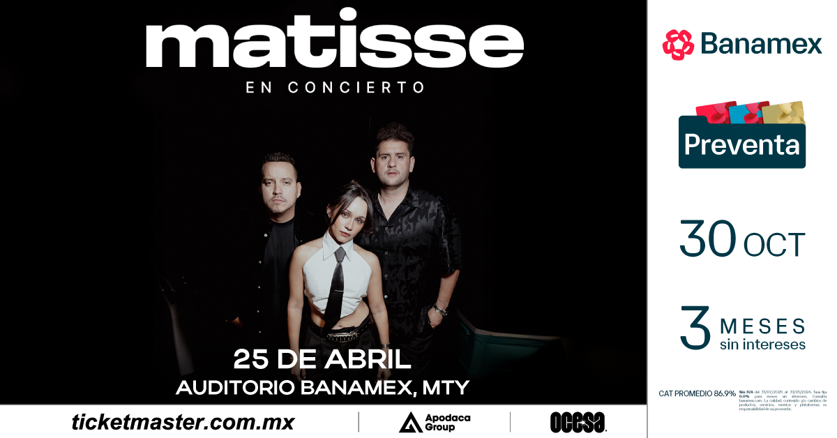 Esta es tu oportunidad de ser parte de una noche de romance y música que te dejará sin aliento. Corre por tus boletos para el 25 de abril en el Auditorio Banamex y prepárate para cantar a todo pulmón junto a Matisse. ¡Te esperamos para celebrar la música que nos hace sentir!