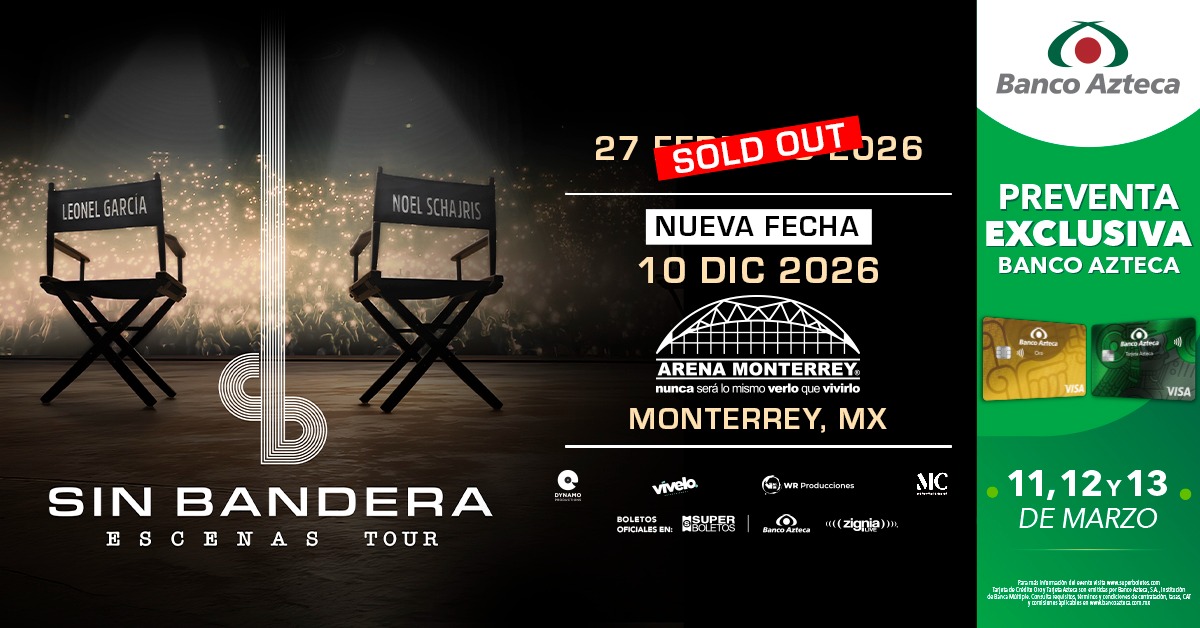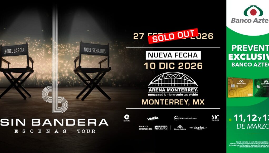 Gracias al cariño del público y su ‘Sold Out’, Sin Bandera regresa a la Arena Monterrey, este próximo 10 de diciembre a las 9:00 de la noche, para seguir celebrando 25 años de música con nuevo álbum y gira “Escenas Tour”.