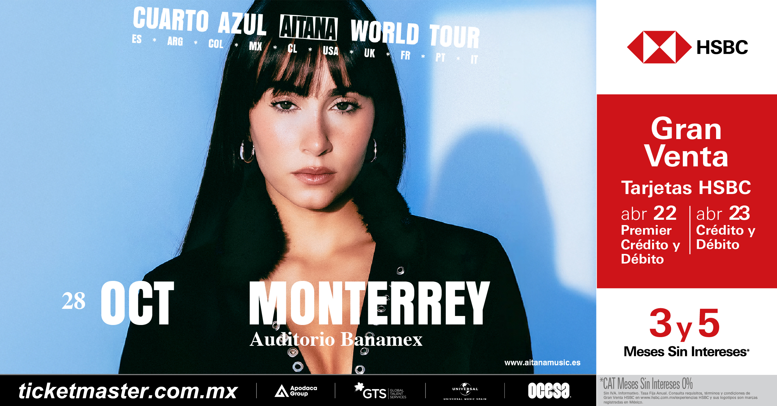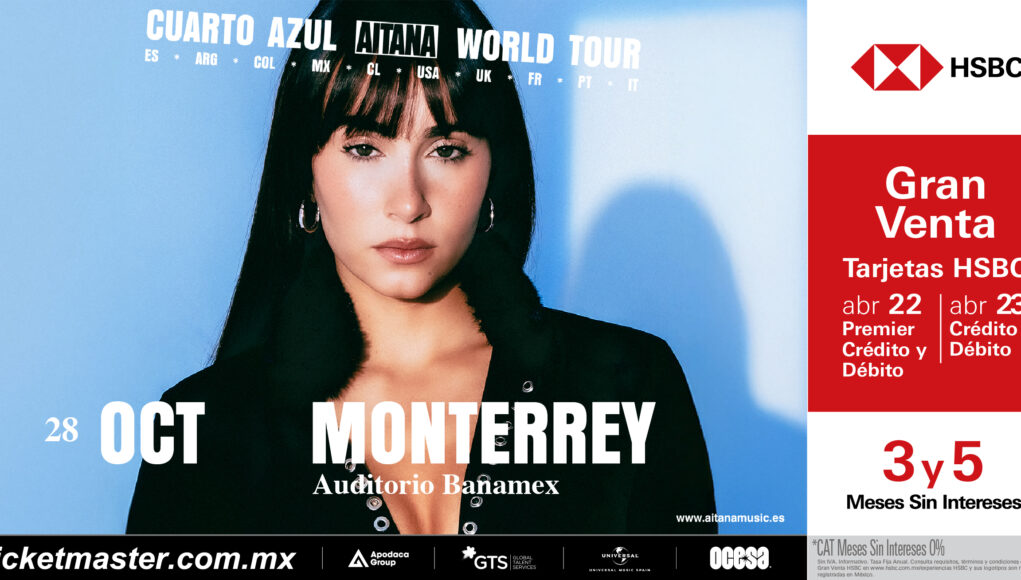 | Aitana se ha convertido en un referente del pop en español y una de las artistas más influyentes del género en la actualidad. Tras un año histórico de reconocimientos, nominaciones y récords, la artista españolaanuncia oficialmente las primeras fechas de su esperada gira mundial CUARTO AZUL WORLD TOUR, con la que conquistará los escenarios de todo el mundo. Tras años de crecimiento, éxitos consecutivos y un impacto cultural que se ha expandido más allá de la música, la cantante española se prepara para reencontrarse con sus seguidores con un espectáculo que promete superar todas las expectativas. La esperada gira dará inicio en su país natal y posteriormente hará el salto internacional, donde pisará países de Latinoamérica, Europa y Norteamérica, lo que será su proyecto más ambicioso hasta la fecha. Si CUARTO AZUL era el viaje íntimo hacia la habitación donde AITANA se sentía libre y vulnerable, CUARTO AZUL WORLD TOUR es la expansión de ese universo: una aventura visual, emocional y sonoraque mostrará a la artista en todas sus dimensiones, llevando su música y su universo creativo a miles de fans de todo el mundo. FACT: Es considerada la artista número #1 del pop español. Reunió a más de 160 mil espectadores en tres conciertos sold out en el Estadio Olímpico Lluís Companys de Barcelona y Riyadh Air Metropolitano de Madrid. Aitana ha consolidado un sonido propio y un estilo que combina sensibilidad, fuerza interpretativa y una estética visual impecable. Su evolución artística ha sido evidente desde sus primeros lanzamientos hasta su actual etapa, caracterizada por una producción más madura, arriesgada y orientada hacia una identidad sonora más internacional.El reflejo de esta trayectoria se ve en el resultado dos nominaciones a los Latin GRAMMY® 2025, incluida la categoría de Mejor Álbum Pop Contemporáneo por CUARTO AZUL. Además, debutó como #1 en diferentes listas de ventas en España. Celebra la conexión única que Aitana ha construido con sus fans, quienes la han acompañado desde sus inicios y continúa disfrutando cada paso junto a ella. Disfruta de la Gran Venta HSBC los días 22 y 23 de abril. Adquiere tus boletos a través de Ticketmaster. La Venta General estará disponible un día después, el 24 de abril. Conecta con Aitana: FACEBOOK I INSTAGRAM I YOUTUBE I TIKTOK |