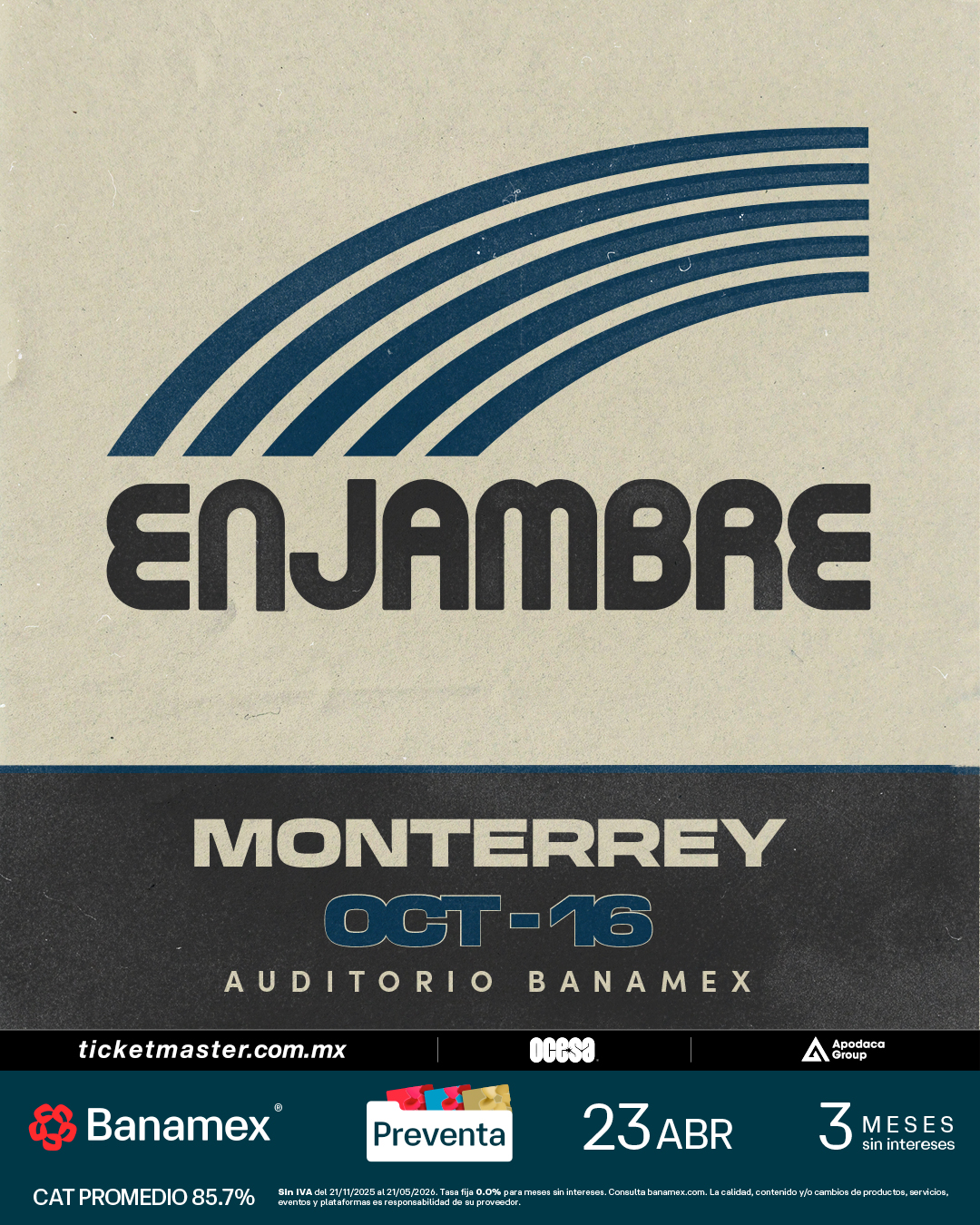 Prepárate para una noche de rock, nostalgia y luz, donde Enjambre demostrará una vez más por qué son el soundtrack de tu vida. Boletos disponibles en Preventa Banamex el próximo 23 de abril y posteriormente en venta libre a partir del 24 de abril en Ticketmaster.